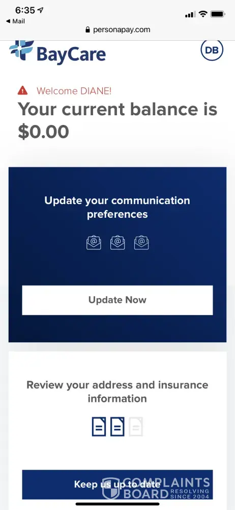 I never agreed to, nor received a bill to our email address. Why weren't we ever billed for this via USPS and why did it take you over 5 months to send a bill stating past due? Meanwhile, I had outpatient testing done months ago and you owe me. I received a text from Bay Care earlier this week saying I had an outstanding balance and when I called was told Bay Care owed me over $50. The testing was done last year as well.