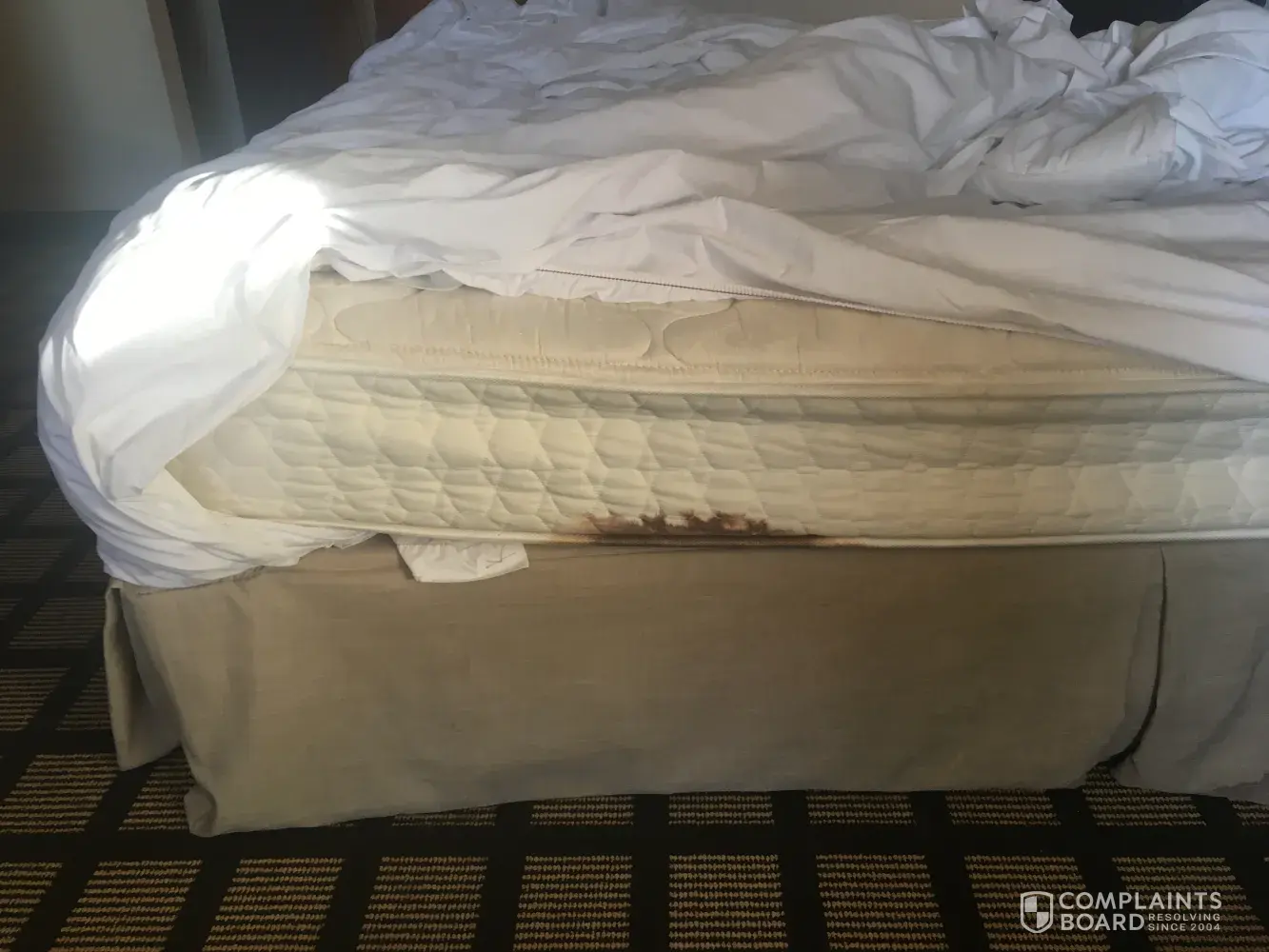 My family and I stayed in a room 219 on Saturday night the 12-15-18. We noticed the door latch was broken (see picture) and did feel unsafe while spending the night but we were already settled. That Sunday am we did notice a large brown/red stain on the mattress (see pictures) it also had a foul smell to it. That Sunday am I went down to the front desk to...
