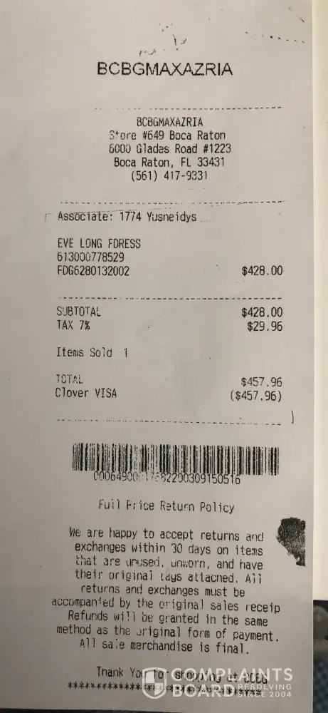 Our conclusion: ComplaintsBoard rates BCBG Max Azria highly, which means their services are pretty reliable. Despite this, their 36% complaint resolution rate raises questions. We recommend users check reviews and complaints about BCBG Max Azria to understand what to expect from them.