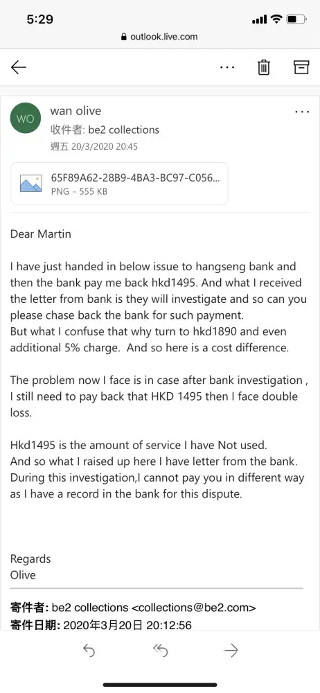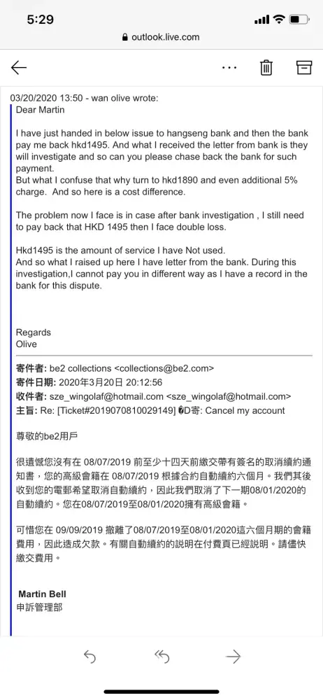 The payment to be2 has been stopped by my local bank (I paid via credit card) as it is suspected case that be2 should not charge me for the unused period of service. From the bank letter, I note that my bank - hang seng bank has put my transaction into investigation and so will also contact be2's merchant bank. The case happened in jul 2019. By the way, it is so difficult to cut the account, fax nos is not workable; I send by mail but not received notice (I have paid for that service), finally I said I will complain to the authority, only then I receive feedback by email my account can be cancelled.