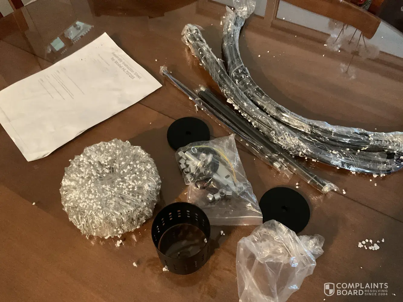 Order shipped 2/6/22 for light chandelier but came in multiple parts with 24 crystals missing. Would take $200 plus to have someone assemble. System was also setup with Europe sockets which needs to be converted. Request some payment for system buildout or may have to return for refund. If you can help with assembly and get crystals will think of keeping but not able to do myself. Invoice #: [protected] and paid via Paypal. Model #: HL561755.