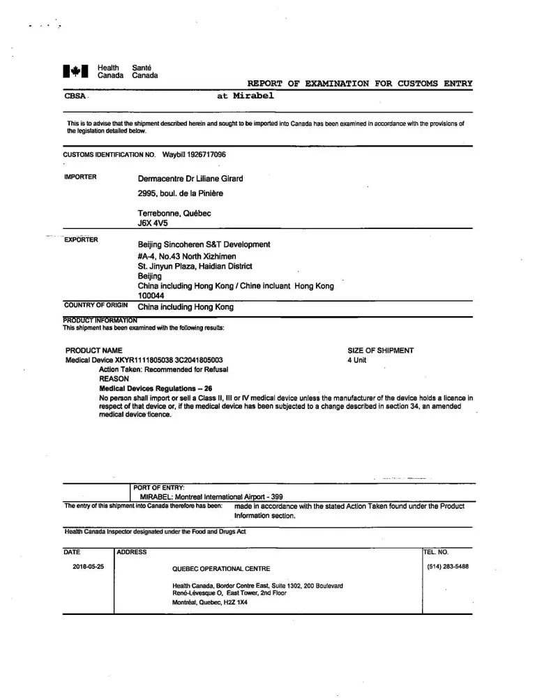 Read full complaintBeijing Sincoheren Science & Technology - Precipulse rejected by health canada at customs