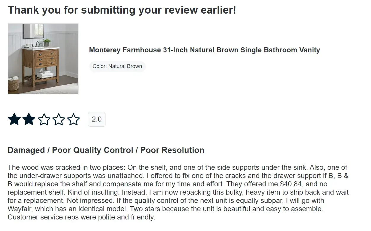 Ordered Monterey Farmhouse 31-Inch Natural Brown Single Bathroom Vanity on Feb 9, 2025. Item arrived damaged. Ordered replacement and returned 1st item. Replacement arrived damaged. Both items returned & promised refund of $489.51 by March7, 2025. Still waiting. Posted a review for 2 stars. My review was NOT posted. Only reviews showing are all 5 star...