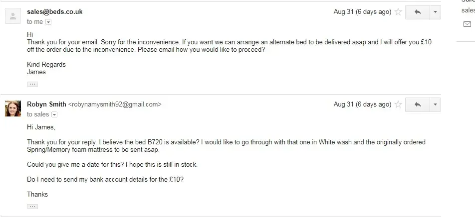 At this point I was offered 10 pounds for the inconvenience and to change the bed order so that I would be able to receive delivery sooner. I agreed to this and gave them a list of the beds that I would consider taking.