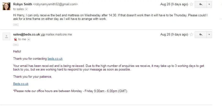 I would like to complain about the service I have received from beds.co.uk regarding the handing of my bed frame and mattress. I ordered both of these on the 23rd August and called to specify that I cannot receive the items until the 11th Aug or after as the 11th is the date I will be moving into the property. The lady on the phone assured me that I will not receive the bed until after move in date and I will be contacted to arrange a suitable delivery date.
