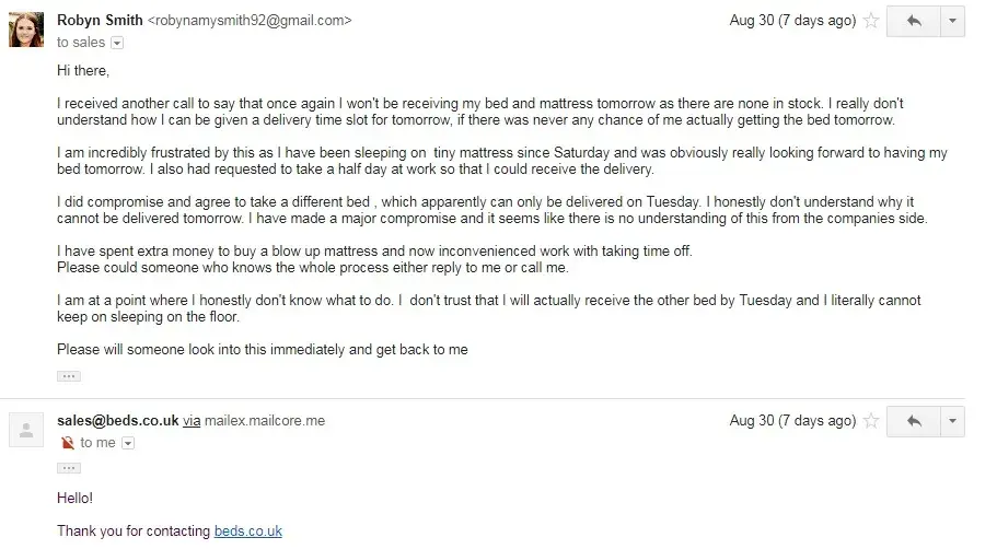 Although annoyed, I accepted this. I did, however, ask if the mattress could be delivered so that I would have something to sleep on. After multiple attempts to call someone at Beds.co.uk, they informed me that the mattress could not be delivered because their vans were not coming to my area.