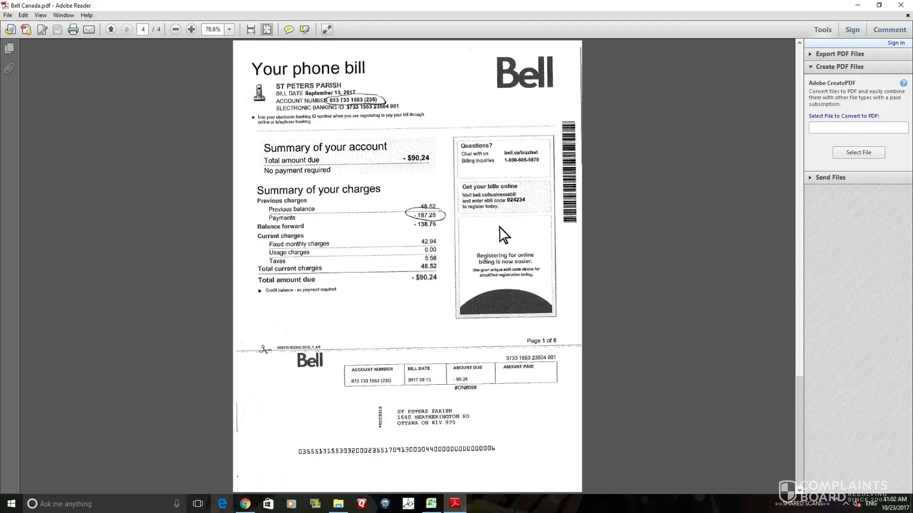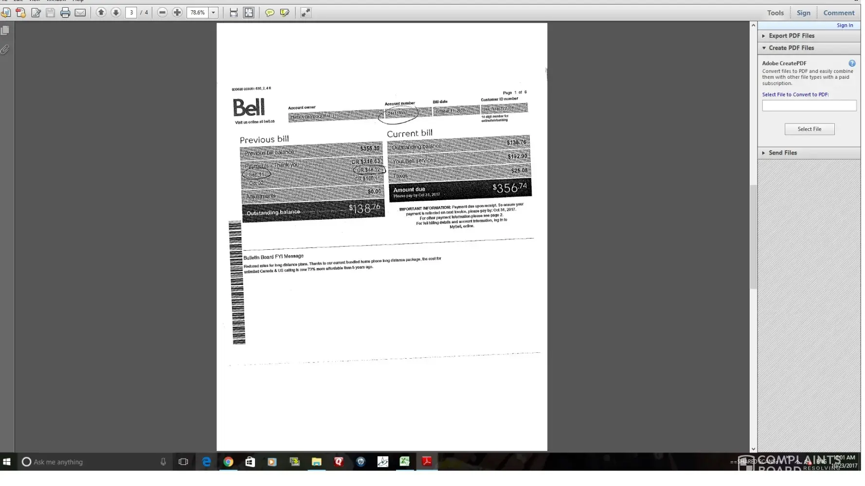 --again last month Bell sent me a bill for $351.60 which Elgin supervisor Ref 9539709 apologized and changed to $129.48 on aug 24/2017