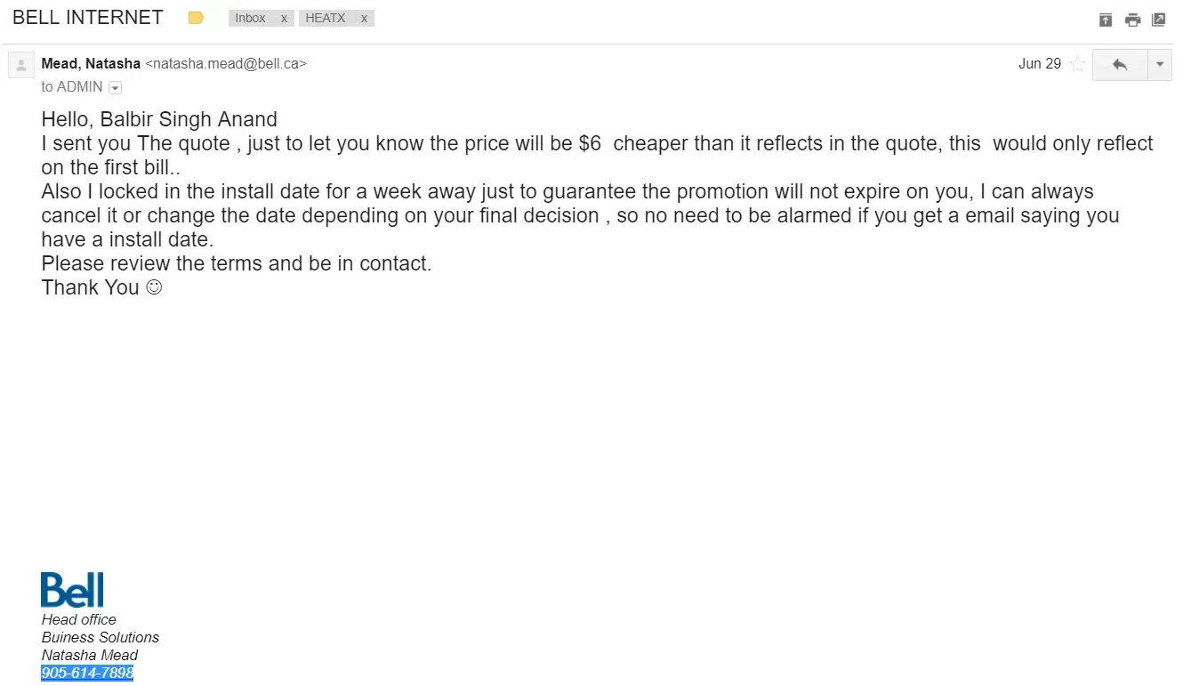 If you have any questions about the discounts, speak with Natasha Mead (natasha.[protected]@bell.ca, [protected]), the sales rep.