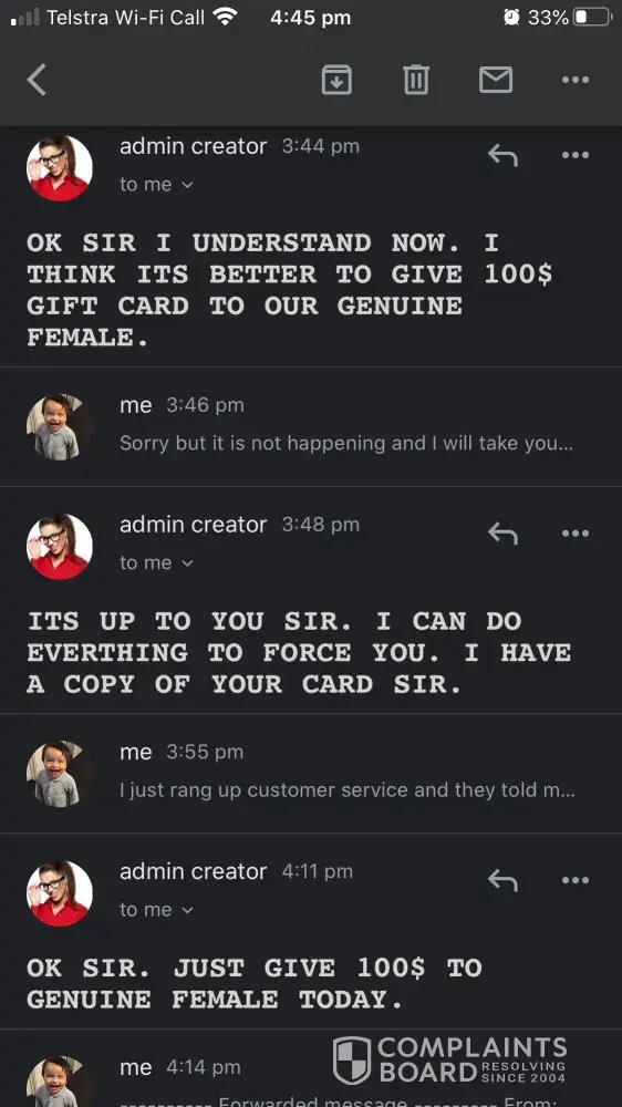I thought this was legit so I tried it like most males paid my one day subscription and then after got billed for 42 dollars for a 3 day subscription when I would not pay for that saying that I pressed on it when I didn't, then had heaps of girls asking me for my emails so I stupidly gave my email adress to one and she has not stop abusing me asking me for a gift card for 250 now 100, and saying if I don't send her the cash or gift card then they will report me to the cyber criminal police and saying that I will get imprisonment for 2 yrs.