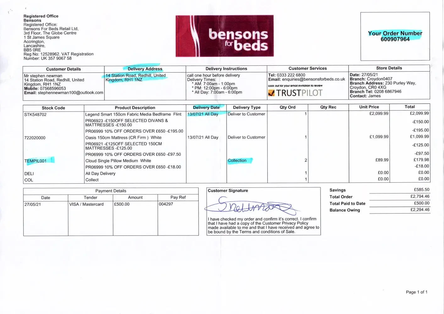 the Bensons website. He confirmed the delivery number and I asked for mine to updated with my number,