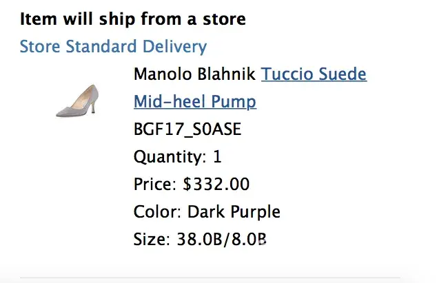I bought a pair of Malnolo Blahnik and they are a little too big. So I return ed them using the return label in the package and dropped off the box. Two WEEKS later I reached out the customer service and they say they did not receive the goods. I live in Baltimore and BG is in NY (and the address of the return label also says it's in NY), which is only like two hours driving.