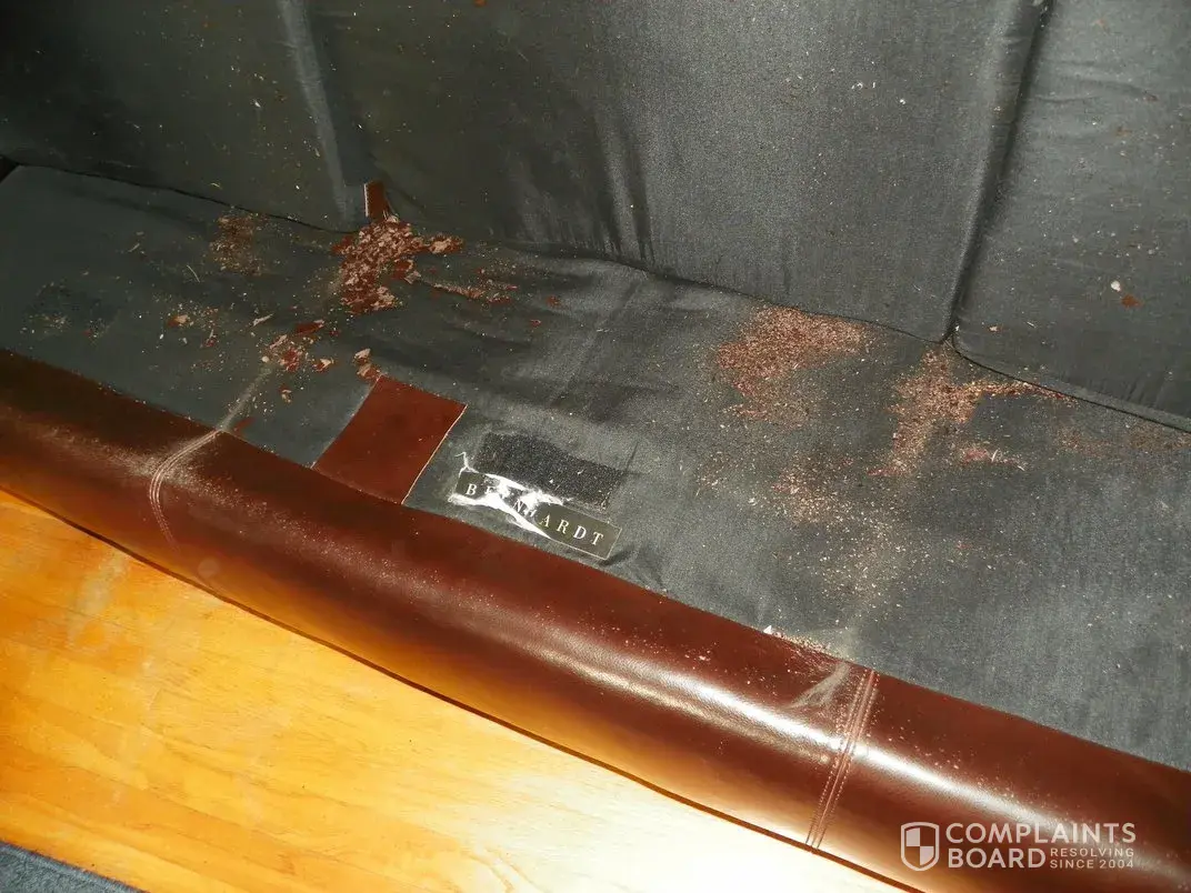 In November of 2006 I bought a Bernhardt couch from the Bernhardt Outlet store while visiting Hickory, NC. Within several months of buying the couch, the leather started flaking off. This seemed extremely strange since we have never had a cat, dog, or other animal. Now it is about 7.5 years later and the couch is horrible looking, even though we have never had any animal in the house. We have had a cover on our couch over the last couple of years since it is such a mess. The flakes of material on the couch get all over our house and we literally have to sweep or vacuum around the couch every day. As you can see from the pictures, the couch is in horrible shape. Today I realized there is a hole in the material as well. I will NEVER buy any piece of Bernhardt Furniture again. The quality of our Bernhardt couch is unacceptable and I wasted a lot of money on this purchase ($835 to be exact plus a hefty shipping fee). I called the Bernhardt outlet in Hickory and was able to get copies of the receipt from them. They also sent me my "Terms and Conditions" file copy which I NEVER SIGNED! (Pic of unsigned document is attached).