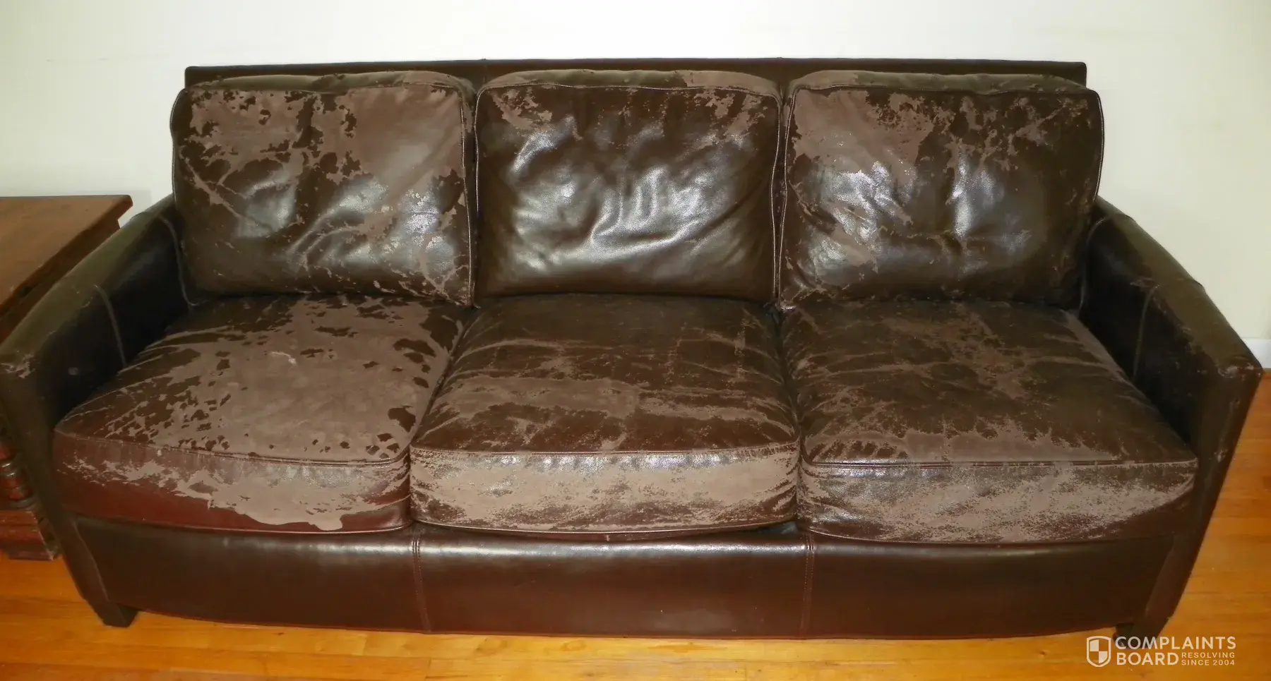 We've had one of their top grain leather couches for 10 years and it still looks and wears great. It had minor scratches and the seat cushions had lightened from wear. A simple application of leather cream brought it back to a much newer and richer look. What happened to your couch is awful and i don't blame you for documenting it. From personal experience, I can say their couches hold up well. I'm betting you had one in which the leather was bad from the get go. They sold it as-is because of that, but I guess this is an example of buyer beware when it comes to these kinds of items.