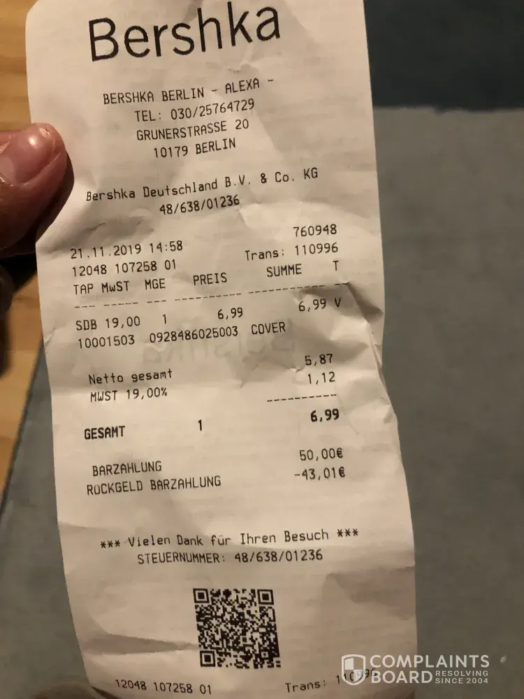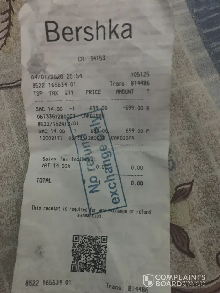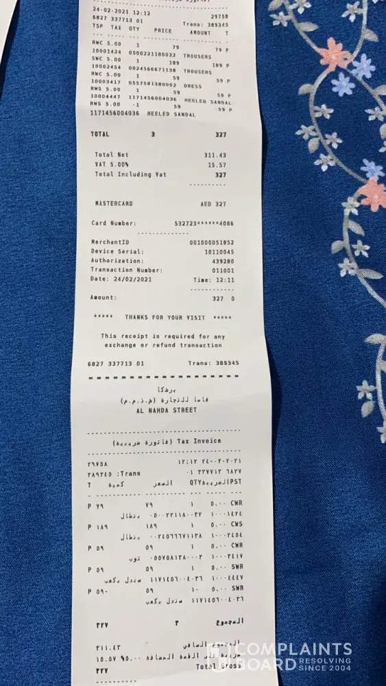 On the date of the incident, I bought clothes from Bershka branch Al Nahda Street, with the total of AED 327 including the VAT.