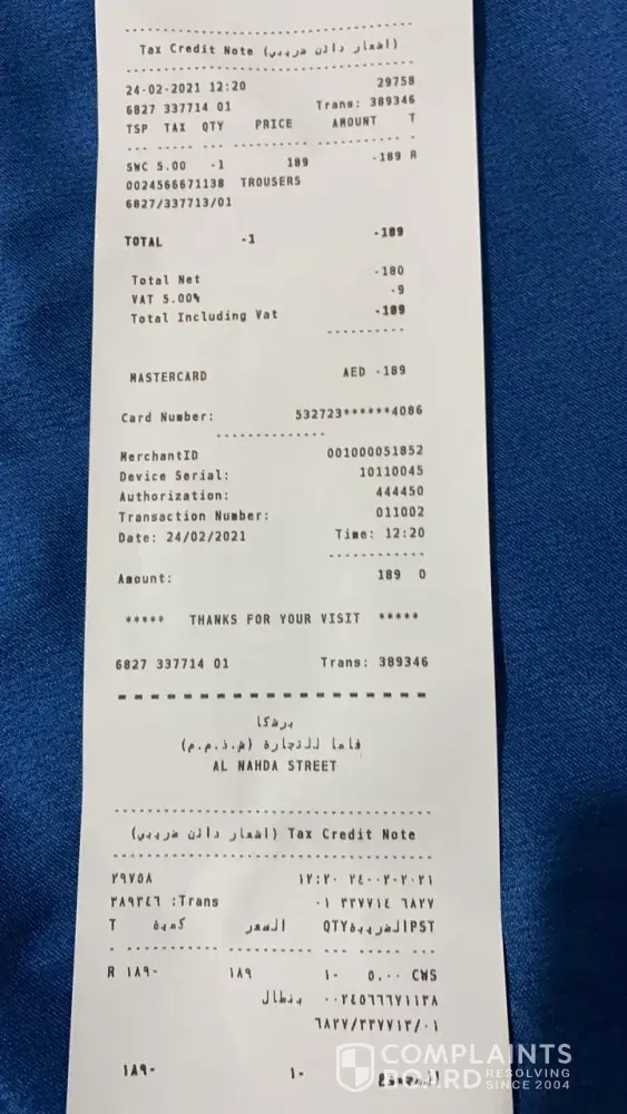 few minutes later at 12:20, I changed my mind and came back to return trousers I bought with AED 189.