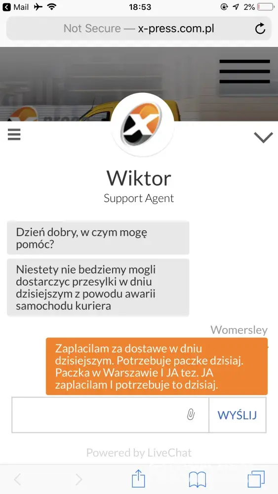 It is now 7pm the following day and I still have not received my order. Despite trying to contact the courier several times and being ignored on the online chatting system. When I finally got a response I was told that my delivery will not come today due to the driver having a road accident on route.