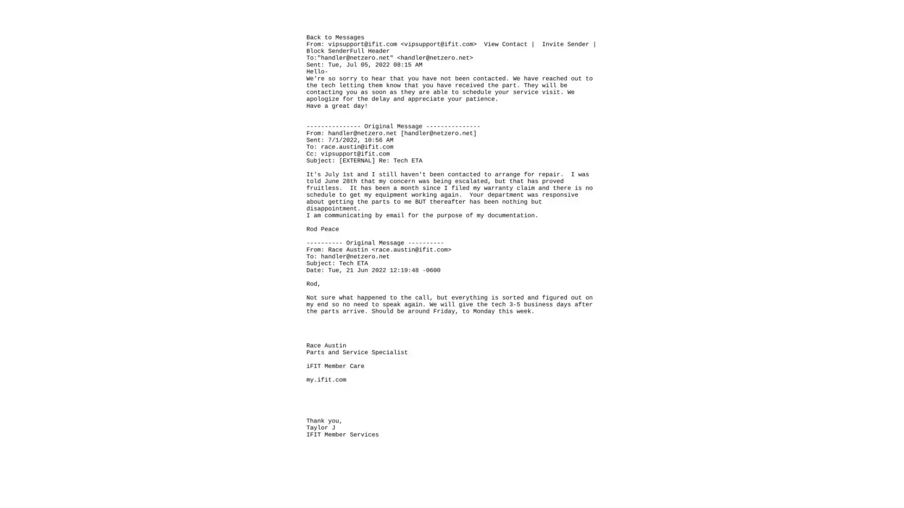 Proform equip. purchased 10-21-21 with 1yr parts and labor warranty. On June 5, 2022, I contacted the manuf. of a broken part. They agreed to do the repair under my parts and labor warranty. They sent me all the parts necessary for the repair by June 17th. They told me to expect to contacted by a contractor to schedule the installation within 3-5 business days (from June 17th). Many inquiries by phone and email all reiterated I would be contacted to schedule the installation but nothing has happened. The manuf. has abandoned my warranty parts installation, after their last email to me dated July 5th, 2022.