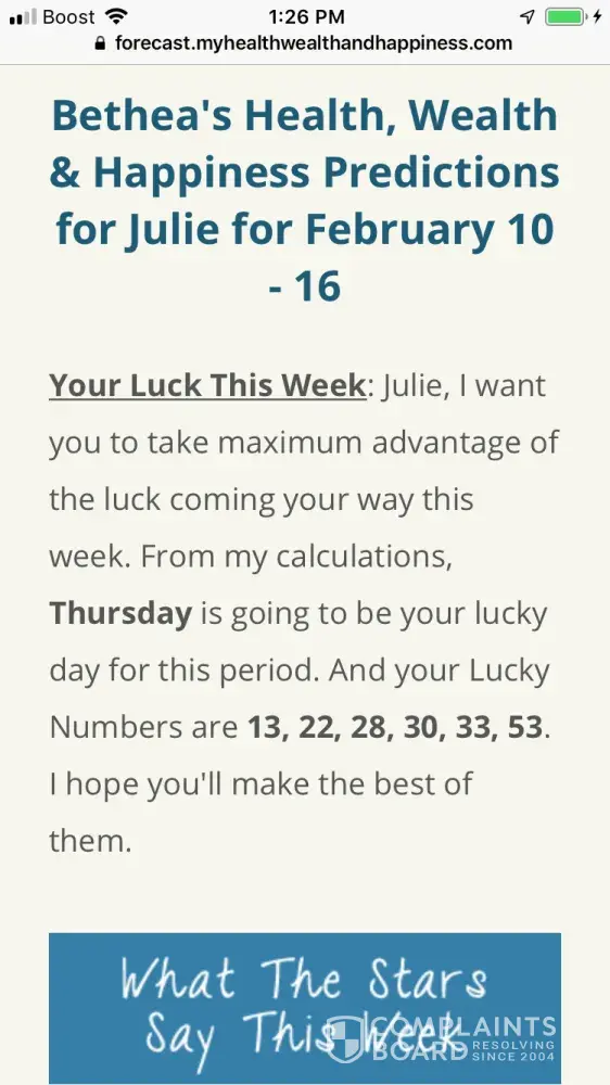 Bethea Jenner / MyHealthWealthAndHappiness.com / MyHWH.com’s earns a 3.8-star rating from 0 reviews and 74 complaints, showing that the majority of clients are satisfied with astrological guidance and products.