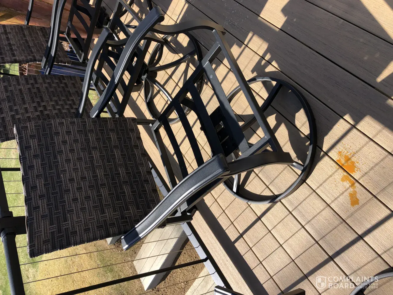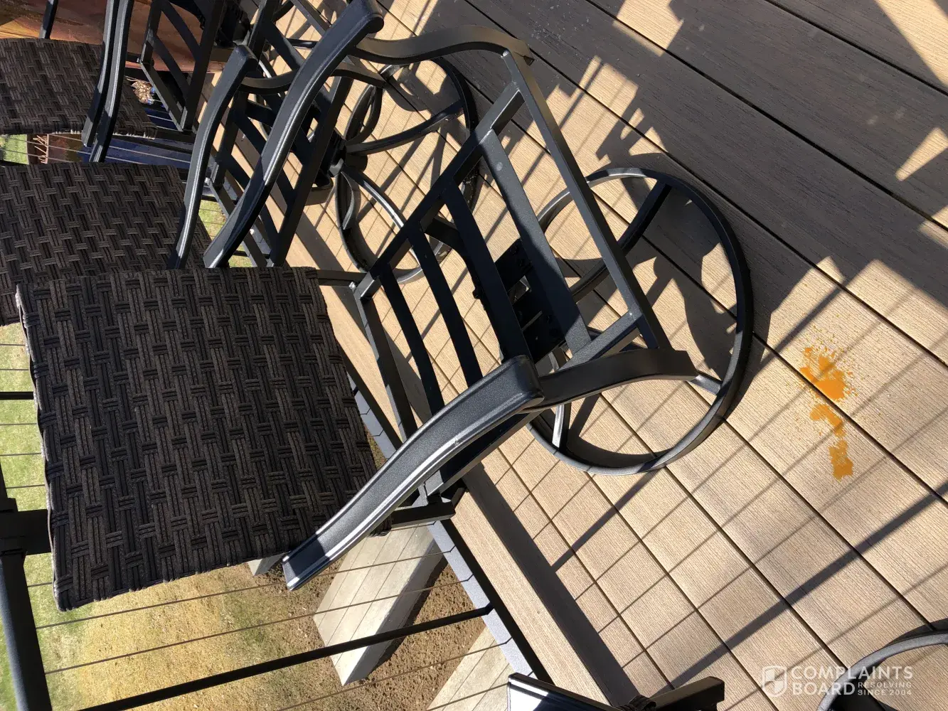 I purchased the Elmdale 5 piece outdoor dining set 1 month ago. Somehow water is getting INSIDE the arms. When you tip the chair or swivel from the bottom of the arm RUSTY water leaks out! I have a brand new deck and this is a huge problem. BHG said to call Walmart not them? Walmart wants to give me $50 for my troubles. Now what? I cannot take back to Walmart I would have to get a truck. So frustrated. No one wants to help and I have 4 useless swivel chairs. See pictures below ALL 4 CHAIRS!