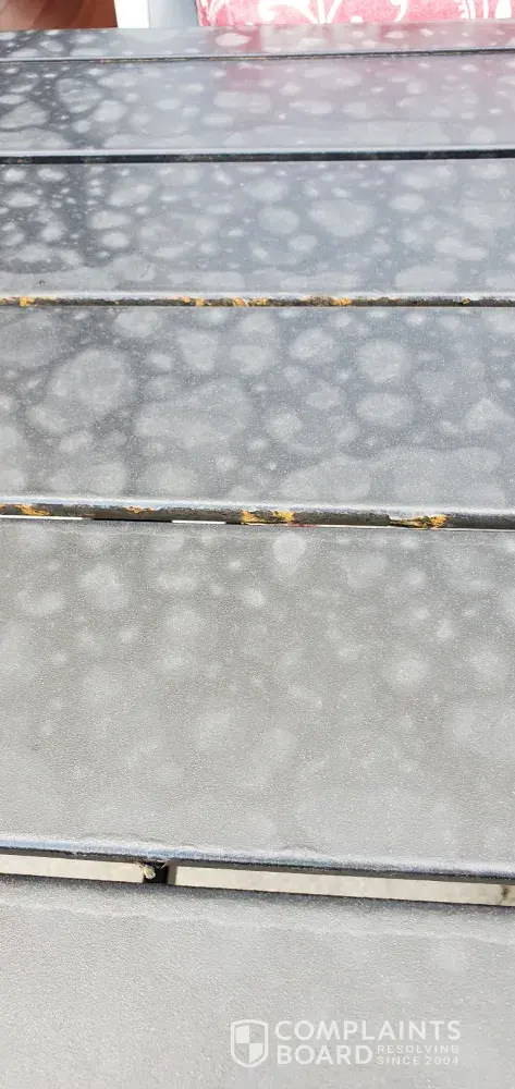 Purchased outdoor table and chairs in mid-March... Was unable to use the set for a month while the table legs were replaced for not having the holes required for the screws to attach. Finally get that done and now 3 months later it is all rusting... All the pieces have different level of rusts. Complaining to Walmart proved to be a waste if an hour of my time, since it's past 30days they do nothing about it. $551 was spent on this furniture and it is already rusted... Terrible