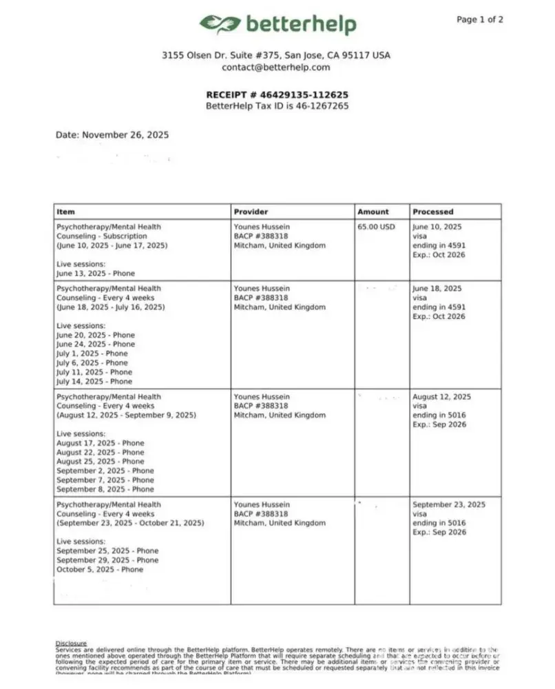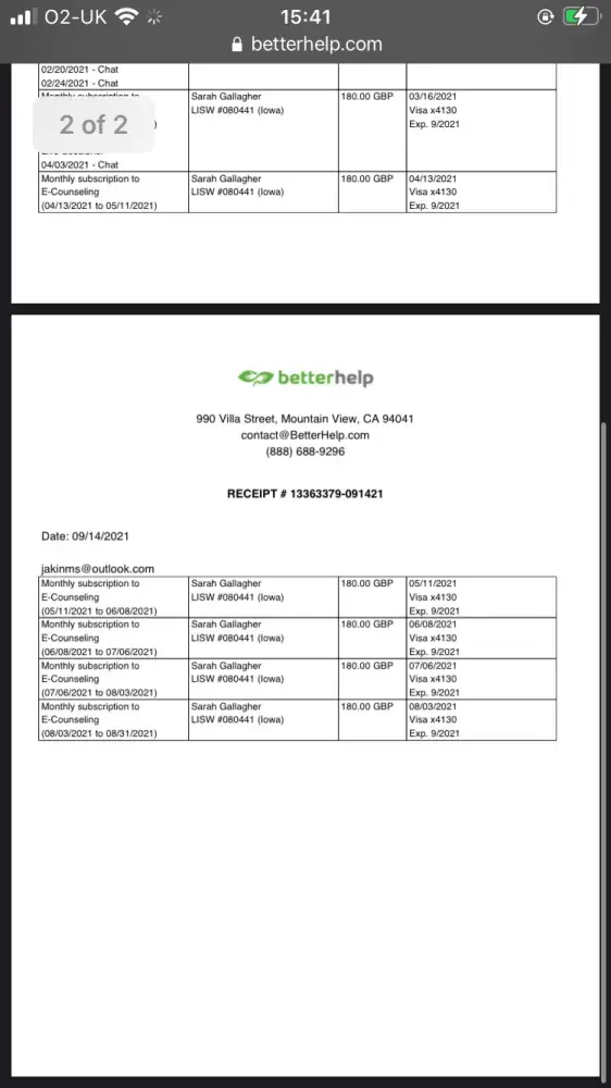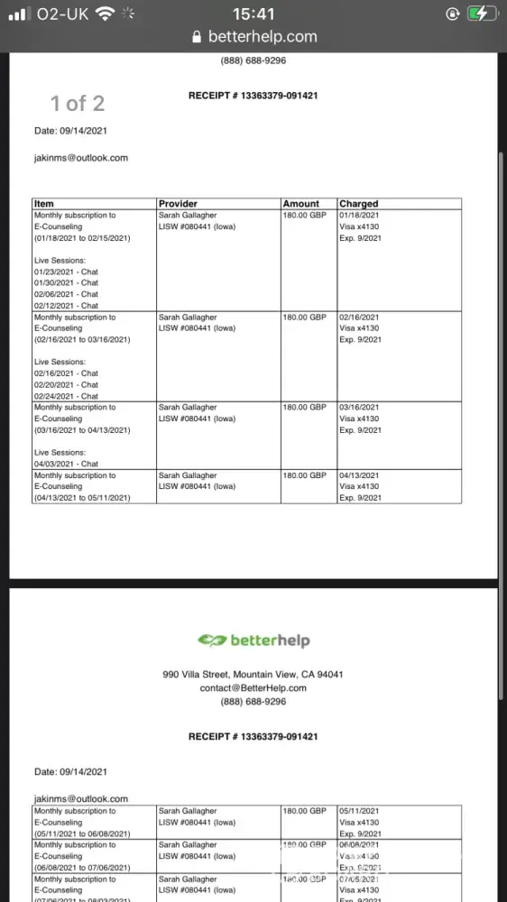 I am attaching pictures of the invoices - I know that several of these live chats were significantly shortened by the therapist's lateness but this is not reflected on the invoices, which only show whether I attended or not.