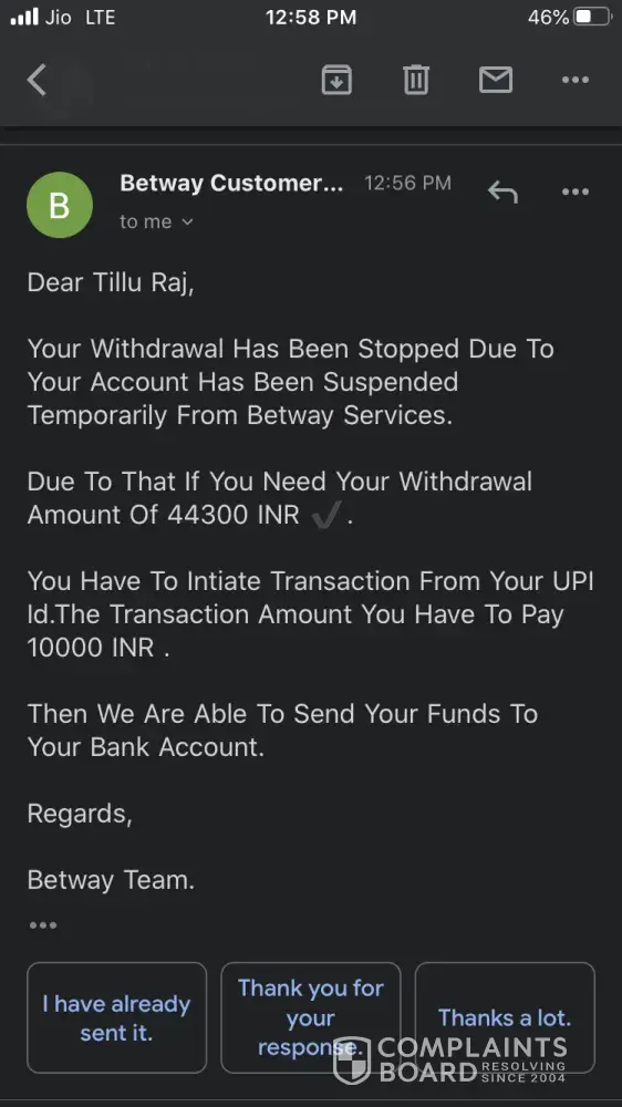 I had made the payment to the betway but my mistake was I made it from my wife's account and later I saw that if there is a name mismatch then amount will be refunded to the original payment account. I sent the screenshot, I sent the bank statement still no response. they keep on asking for the bank statement with the bank logo, full name mentioned. I keep sending and my 4000 Rs. is stuck. is there any way get rid of it? I am sure that I won't use betway for any purpose in the future once i get my money back.