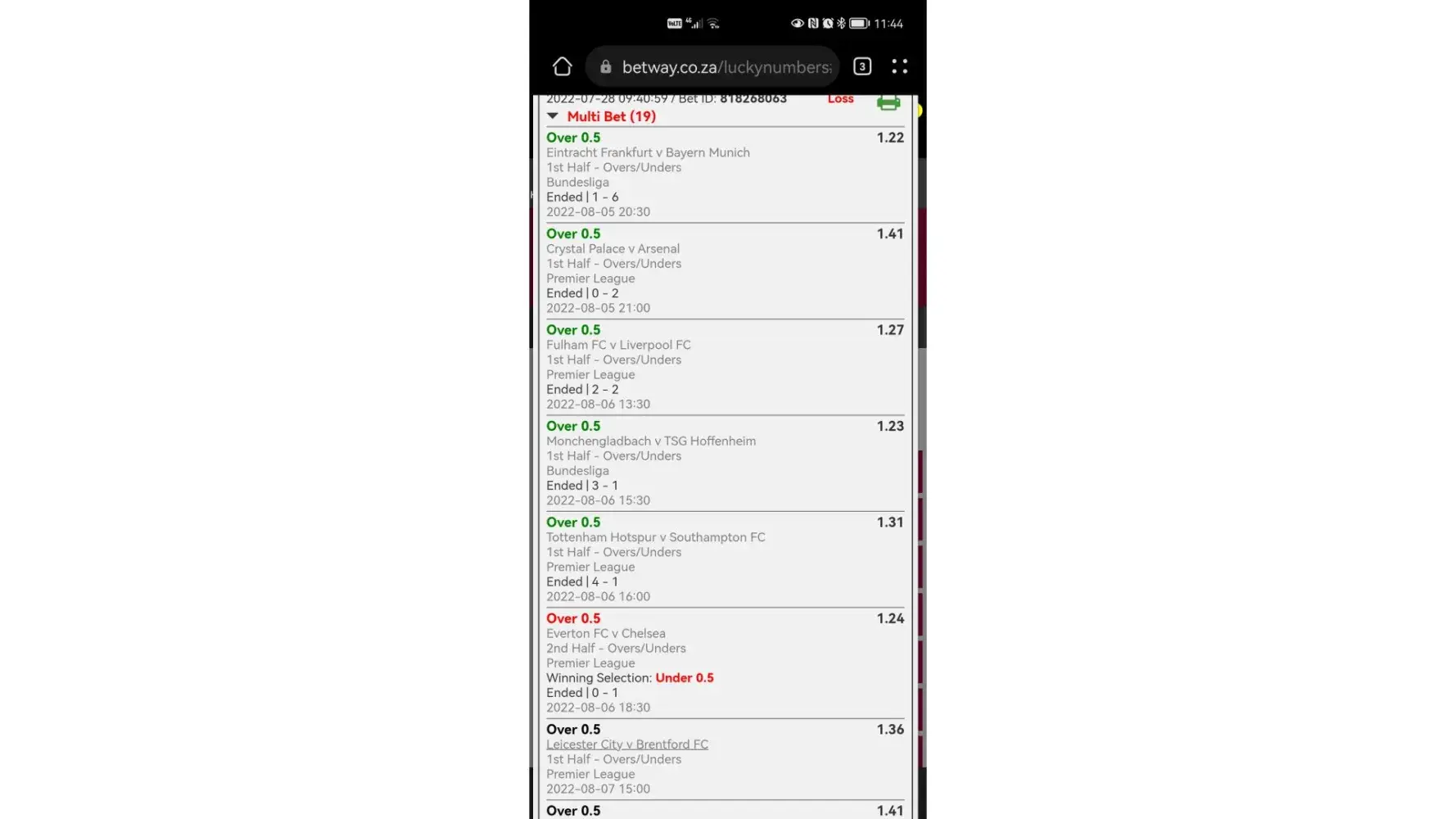 I placed a bet of over 0.5 odds over the the team won 2-0. And the result says its under 0.5 the ticket is a loss who ch I know is not right. Tried using the Betway chat no response at all. Contacted Twitter no respinse