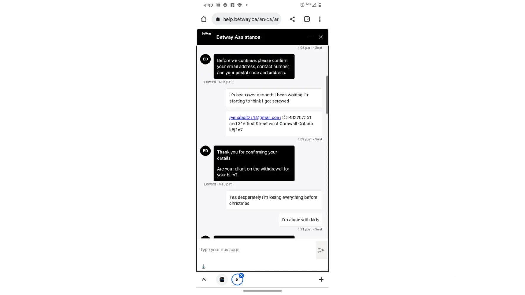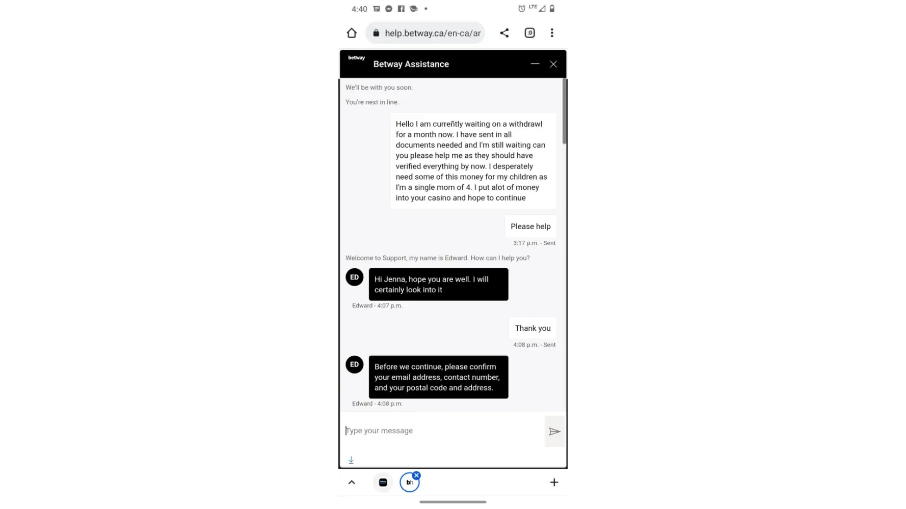 Hello my name is Jenna boltz I have an account with betway and was woundering if you can help me. I spend alot of money at this casino and ended up winning I have been waiting 5 weeks I've sent in multiple documents and no reply to emails. I am a single mom of 4 and desperately needing this cash I'm losing everything before Christmas if I don't end up getting the money that shows paid on my account I may have to send all live chats and proof of sending documents in as I have no other choice I will be homeless. Can someone help me!