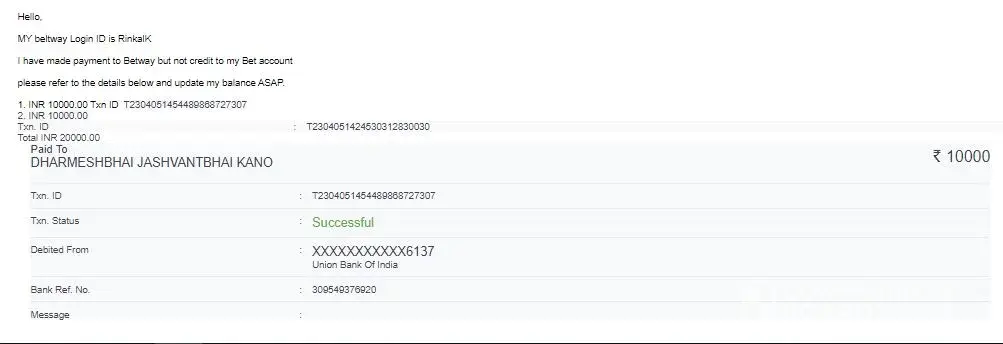 I tried to deposit 3500 INR using upi method. Even after a successful transaction, they didn't credit the money into the betway sports account. it has been more than 24 hours but no response from the customer support. this is my first deposit and I am a new customer . This is unacceptable. Looks like some kind of scam. I will process legally againts Betway whatever it takes if I don't get my moeny back within 24 hours. below are the Details
