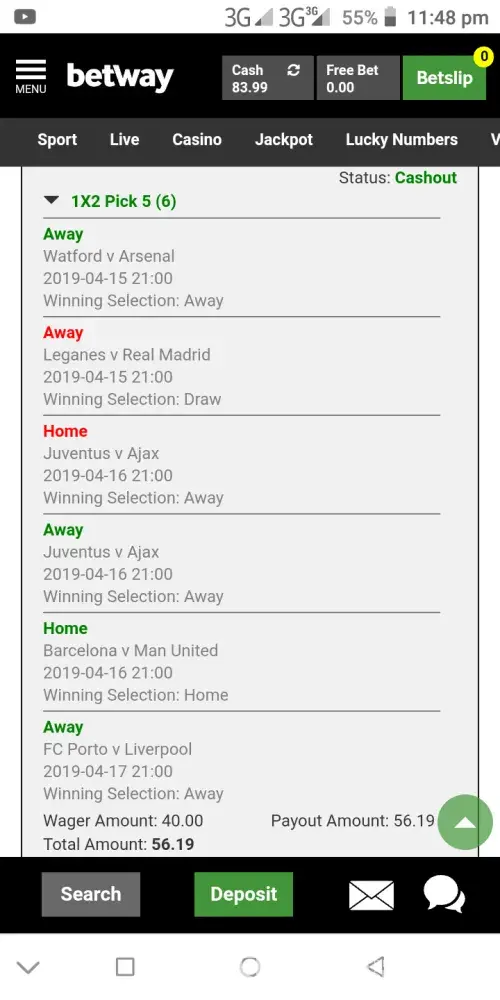 I played the jackpot of 500000 naira. Where you must have at least 4 correct teams 5 teams to win a prize. Juventus Vs Ajax, I predicted Juventus or Ajax win, and Ajax won. I was denied my prize. They said, I lost the game. Yet there is room for multiple lines selection. What they did was to give me a cash out of 56 naira (0.15 dollar) even before the game ended. Below are the details. This is big time fraud.