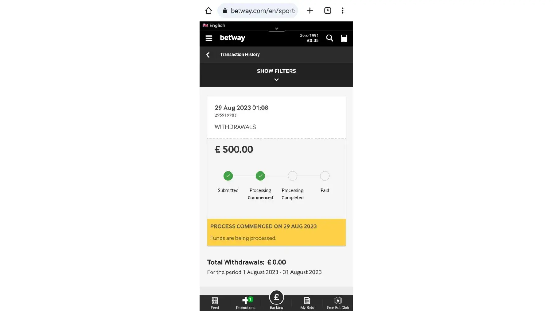 Betway is operating illegally. Fact. I deposited and 3 bets were placed using my money without my consent using my money...I email them and they refuse to take responsibility for faulty software! I deposit again and put a couple I betsbon which return £500, so I withdraw. 5 days later I've not received my withdrawal so I contact betway again and again they completely refuse to take responsibility or help me. I've now had £650 stolen from me by betway...the. Then I notice money was disappearing from my bank account and being deposited in betway and placed on ridiculous bets...nobody know my details apart from betway and myself so betway have compromised my details and have been siphoning money from my account. Terrible terrible website to use and they act outside of the law
