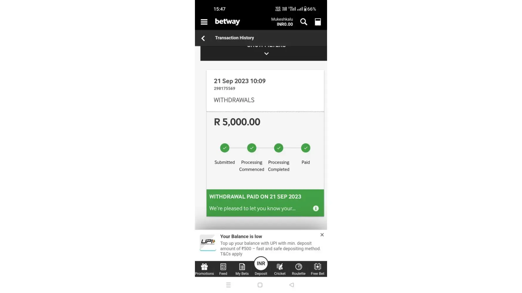 I put in 40 bucks, and over the next couple months I noticed random little amounts being takin from my account. My bank determined it was betway that was taking the money. I did not put in anymore then 40 and over those couple months they stole about 300 from my account directly. Never use this site! They will hack your bank account!