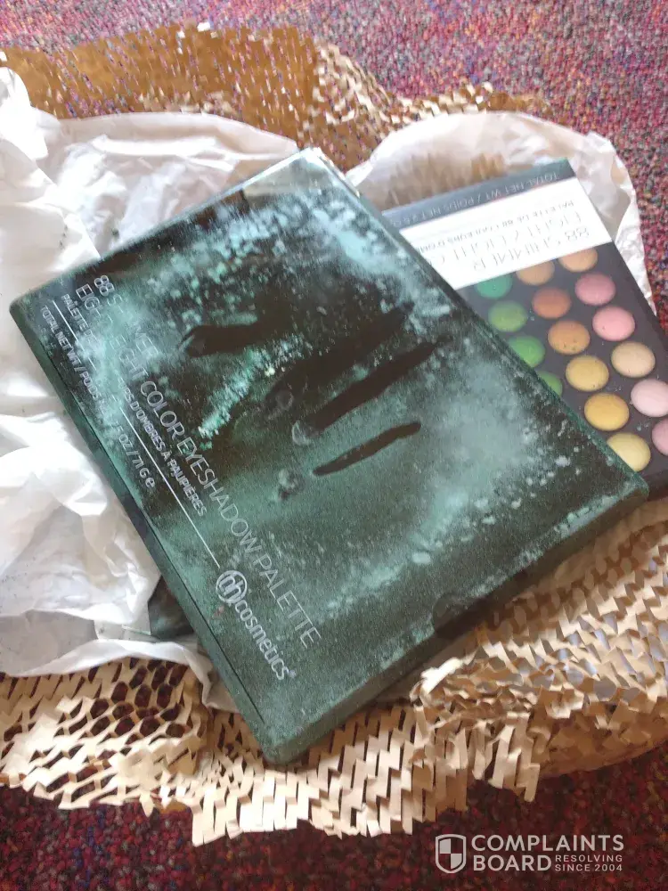 The box was smashed, and the package itself was covered in broken eyeshadow. I opened it to see the damage, and sadly it's beyond repair. How can I acquire either a refund or a new pallet?