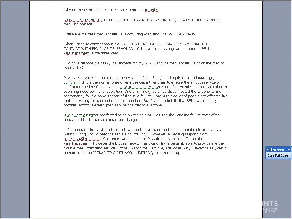 4. Numbers of times, at least thrice in a month have listed problem of complain from my side. But how long I could bear the same I do not know. However, expecting respond from [protected]@bsnl.co.in( Customer care service for Industrial estate Area, Coca cola, Visakhapatnam). However the biggest network service of India certainly able to provide me the trouble free Broadband service I hope. Every time I am only the looser why? Nevertheless, can it be named as the "BEKAR SEVA NETWORK LIMITED". Just check it up.