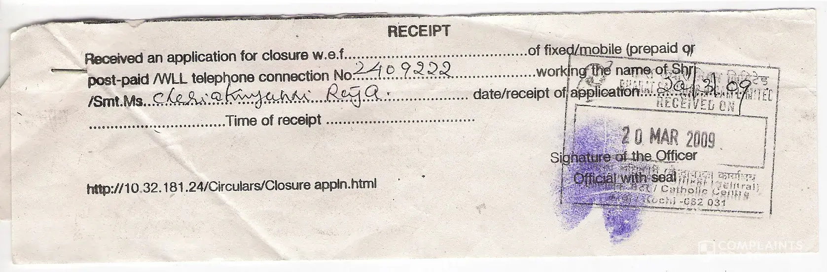 Please note that we have surrendered the telephone no. [protected] belonging to Late Shri K.C.C. Raja on 20th Marach 2009 to BSNL, Ernakulam and also submitted the documents pertaining to the same for obtaining the deposit. As of date, we have not received any reply for the same.