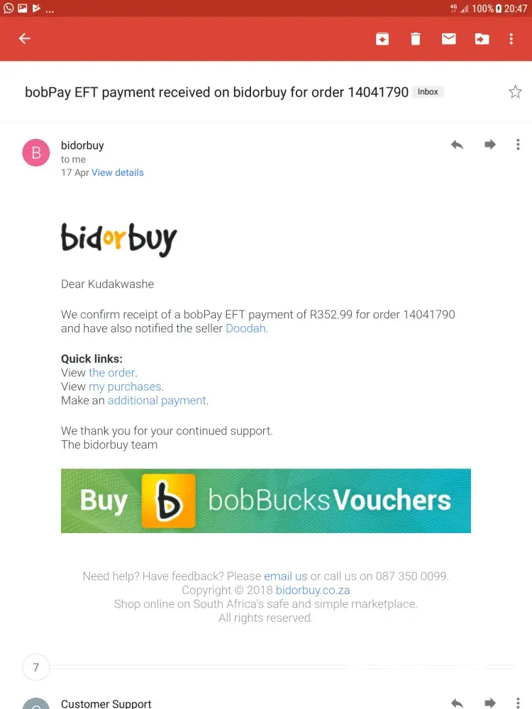 On 28 July 2018 I received an email receipt from BidorBuy saying they'd received the R240.70 I sent for ADIDAS MMA Grappling gloves. The order number is [protected] and the seller is Yourfitstore. They proceeded to email me and ask for a R95 courier fee which I paid and received a receipt for on 13 August 2018.