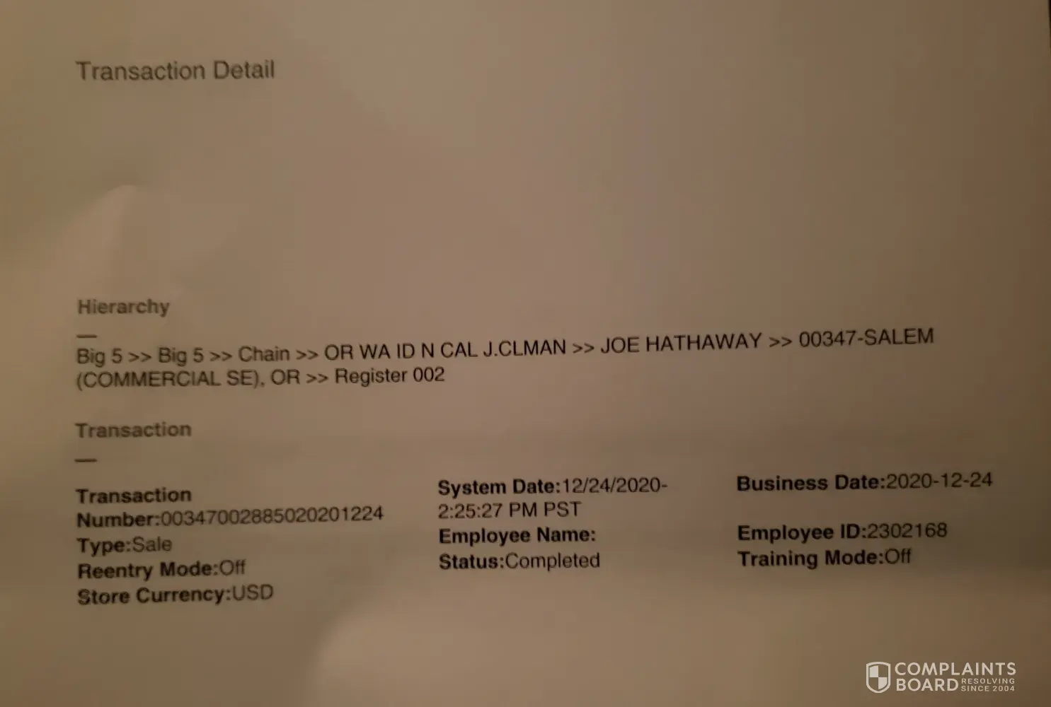The Big 5 Sporting Goods sells defective merchandise in violation of "FTC’s Implied Warranty of Merchantability Laws". Section 2-315 of the FTC Uniform Commercial Code makes it abundantly clear that no company can sell defective products in the United States regardless of what argument or return policies they might present to get away with it.