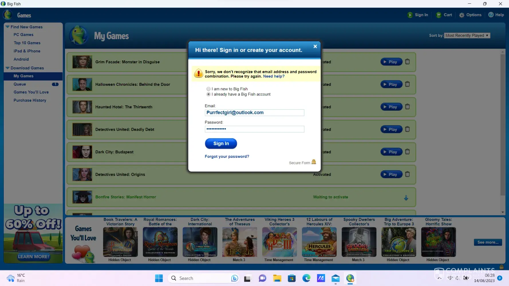 I have over 96 games worth over $800.00 that I can't download I've tried to call big fish and sent emails to no avail. all I get is that my email or password are not correct over and over. I have a listing of all my games from 2010 to 2022 the order numbers, date purchased and the amount I paid. If I can get someone to help me retrieve my purchase history I might be able to download the games back to the new computer