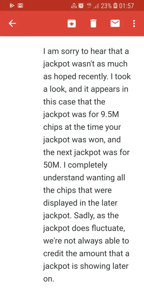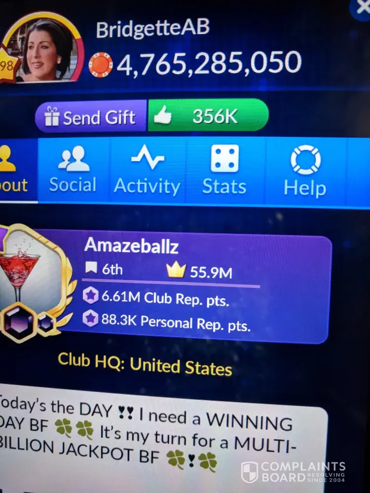 I used to love the jackpot magic slots. I love their games. Bit you just can't win anymore since Aristacrap bought them! Their customer service was the best when Churchill owned it. They actually made you feel appreciated and the actually read what you had to say! It sure as hell isn't now. Most of CS is all scripted and not even on the subject you contacted them about! They even have the nerve to tell you they didn't read your email. Then give you instructions to uninstall and reinstall. Churchill used to let us win and enjoy our purchases. They gave us perks when we spent money in Cashback bonuses popups giving us more coins to spend depending what you spent about 12-24 hrs later. My [censored] has spent thousands over the 2-3yrs I've been playing. NOT NOW. I am convinced they have an ALGORITHM that locks you down from winning when you purcase coins because it's impossible to win after a purchase and it can be up to a week before it lets go of you for a win if you don't purchase anymore coins. I confronted them on it of course the deny it saying that's the odds of the game. They are designed to give you a real casino like experience. I say [censored]. Odds are better at a real casino and you get reall vip perks. There are no perks left in the game anymore. You'd be lucky to get a random perk but they take those and the little win they might give you right back. Make a purchase it's gone in less than 5 minutes even on minimum bets! You can't even enjoy your purchase or the game.! I'm a club leader I can't even help out my club it's so bad!. It's embarrassing. I have a smaller profile I D0 NOT BUY COINS FOR. IT IS AT ABOUT 175M right now. As for this 0ne I don't think I have 50k right now. I spent over 100 this wkend trying to win for the club. I can't hit a win if it was hitting me! I keep buying in hopes the odds would be nice just once and help the club on challenges. I'm a [censored]. At least my mini profile helped the club out. Hell I opted out of the last 2 lawsuits maybe I won't the nest one.