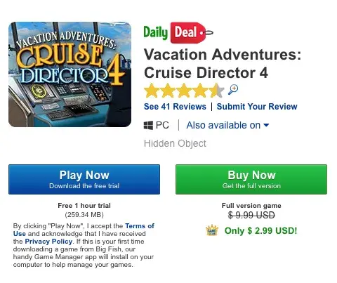 Now, just this morning, I saw the attached main page Daily Deal Ad for the Vacation Adventures: Cruise Director 4 game for $2.99 as well as the attached link-to-page ad, which shows the same thing.