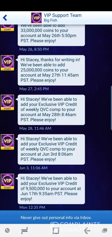 I'm due 126 mil my emails are being ignored I'm in touch with Jeff Karp executive of big fish games personal messages sent... Tate on customer service is ignoring my emails I'm fuming... I've paid now I want what I've paid for due now is 126 mil.. I'm saving and sending all corressponance to Jeff karp also.. so the quicker this matter is solved better for all.. and I'm in contact with Washington gamblers commission to... as this will have to go to next level if the right thing isn't sorted today.. receipts have been sent but ignored.. so I've paid now I want this adding to my account 126 mil owed onto my player is number [protected] thankyou..