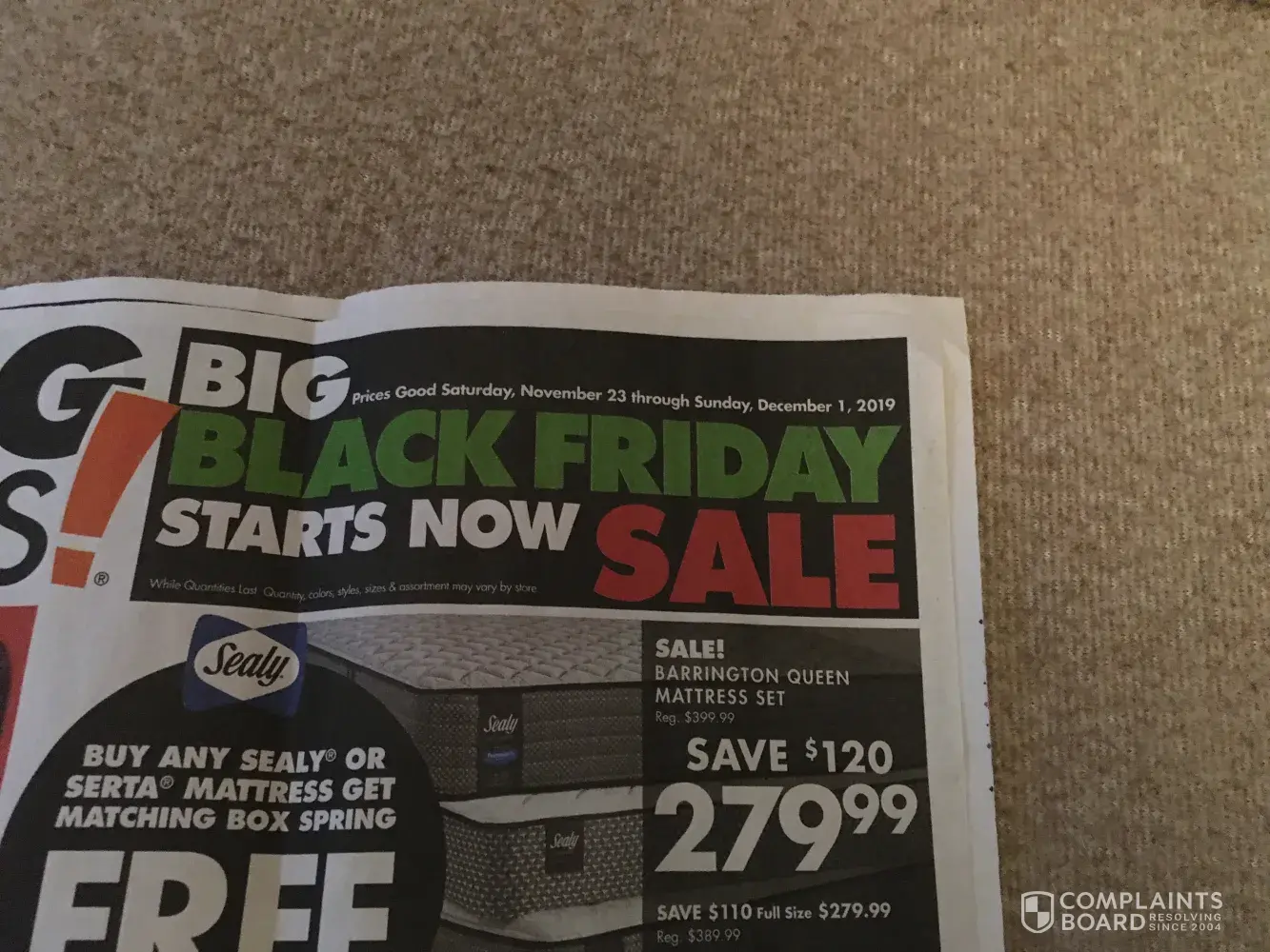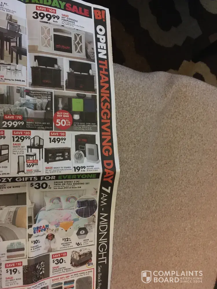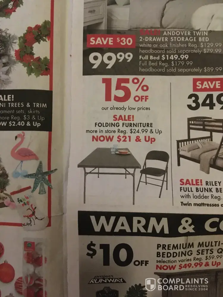 My husband and I went to the Big Lots on November 28, 2019 in Burlington, NC to purchase a fold up bed. We had a sales paper from Big Lots advertising 15% off folding furniture. When paying for a folding bed we asked about the 15% off and was told by the sales clerk that the sale ended at 11am. My husband and I checked the sales ad after purchasing the fold...