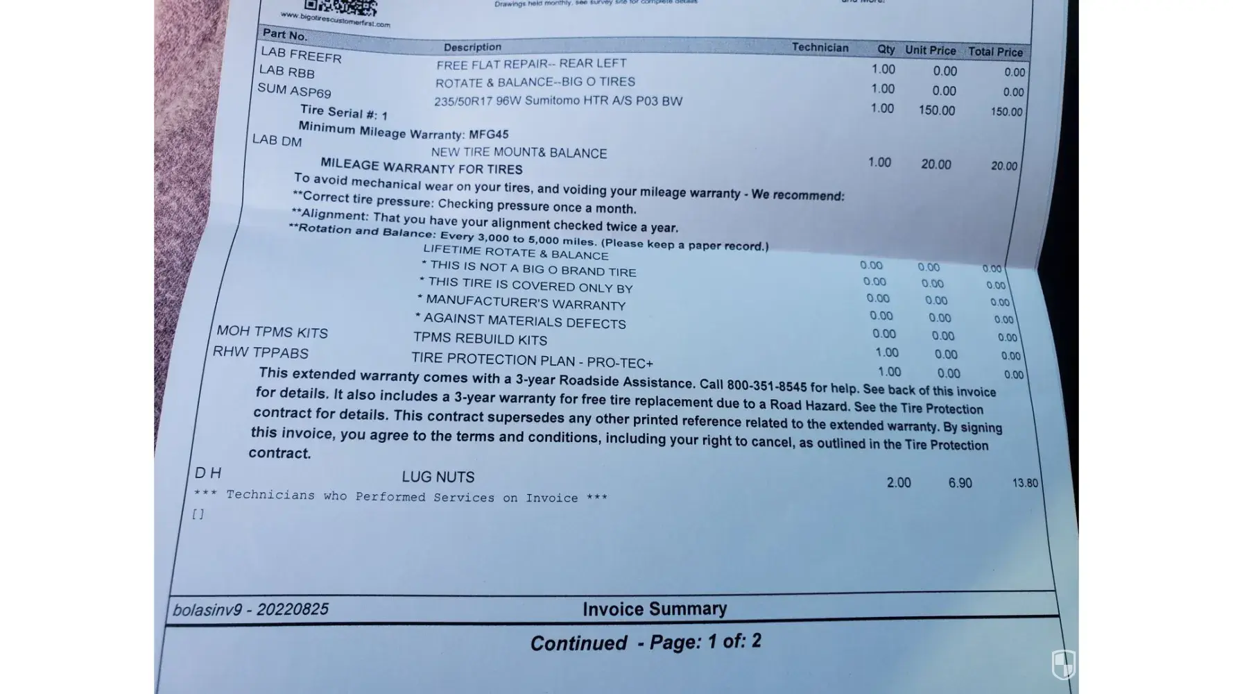 Took car back the same day and reported the problem. I was told “we aren’t charging you for replacing all of the lug nuts we changed the 2 new tires = $99).
