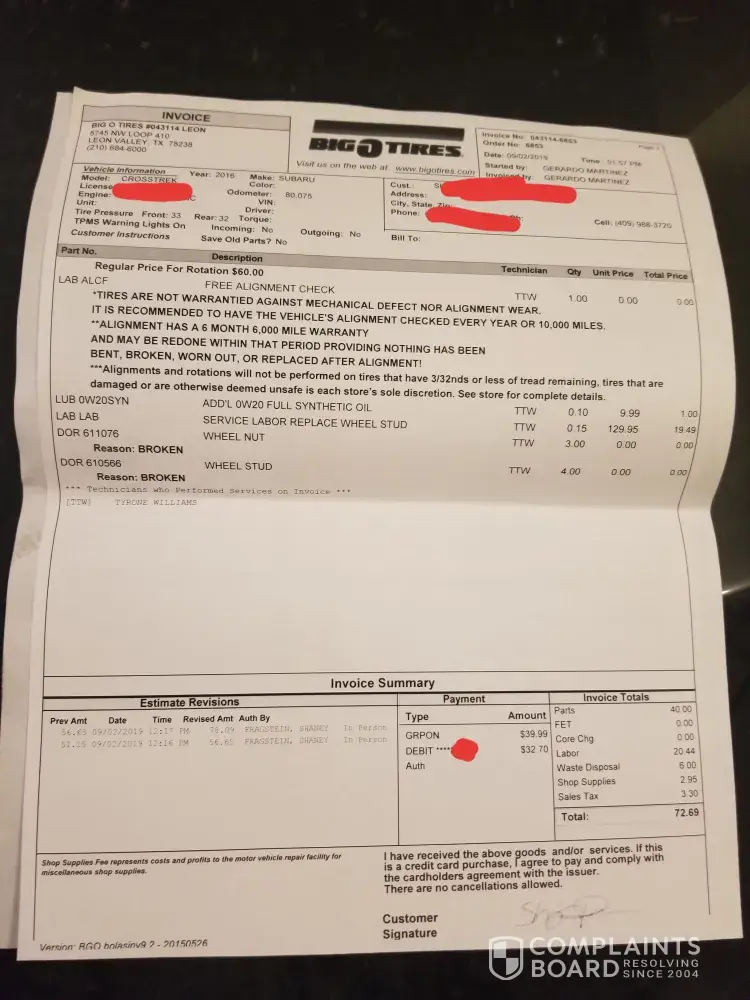Read full complaintcustomer #: [protected] - front end / tires / brakes
