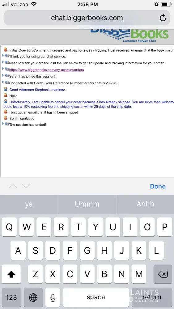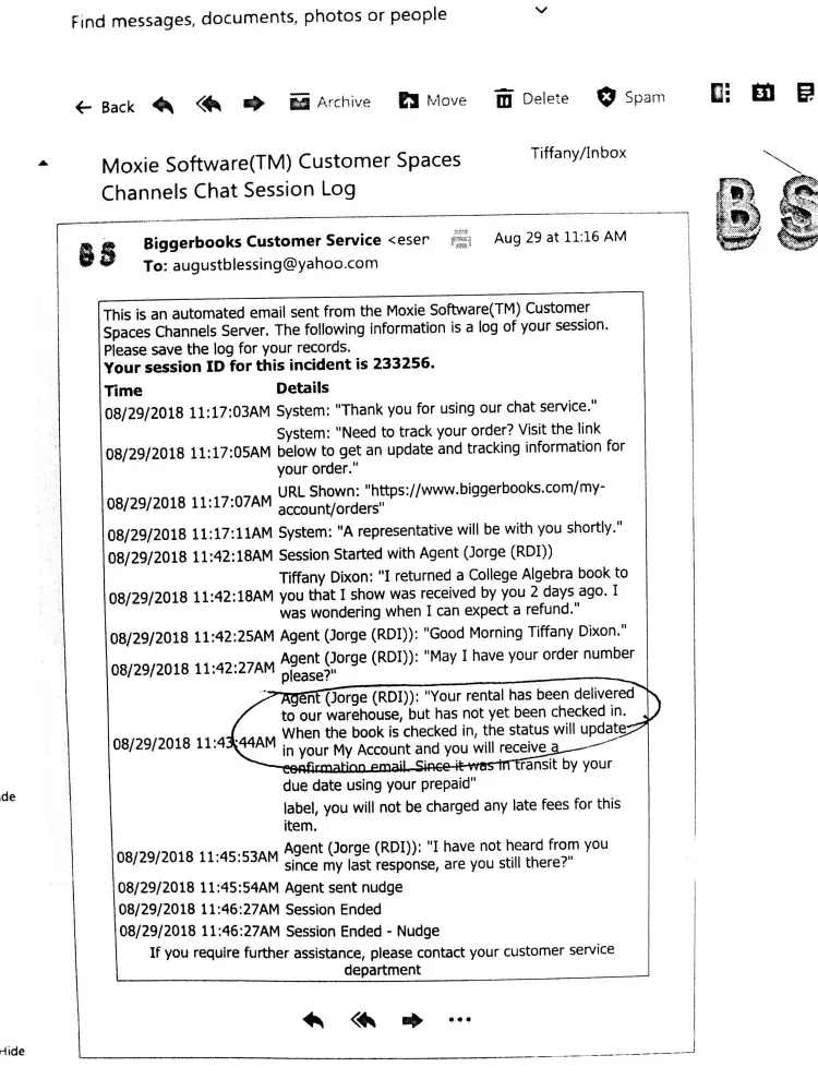 On 9/20/18 I noticed that on the BBB complaint I had sent against the company, a BiggerBooks.com rep commented that a check was going to be mailed to me.