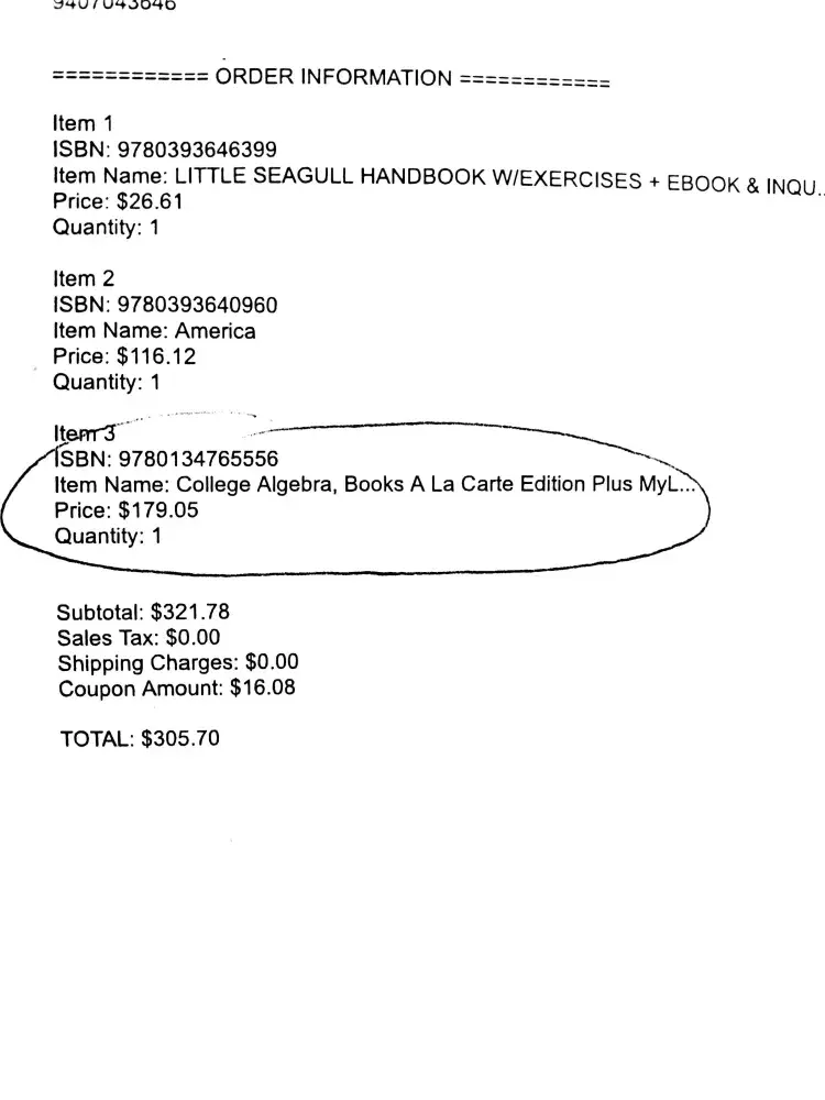 On 8/07/18 I placed an order with BiggerBooks.com (Order # 2586374). One of the books I ordered was “College Algebra, Books A La Carte Edition Plus MyLab Math with eText -- Access Card Package by Blitzer, Robert F. (ISBN ISBN [protected]).