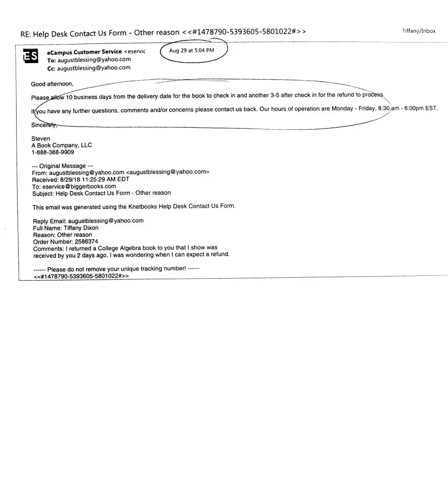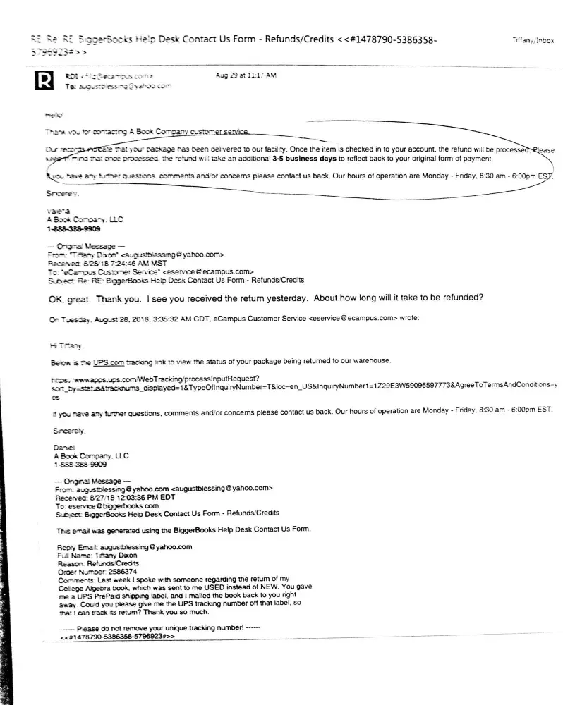 I contacted BiggerBooks.com via email again on 9/12/18 regarding my refund and on 9/14/18 they sent me a response stating "I do apologize and understand your frustration. However the check in process can take up to 3-6 weeks and there is nothing we can do to speed this along. We are not holding your refund from you. As soon as it checks in you will receive a full refund." So now the check in time frame has changed from 10 business days to 3-6 weeks! This is highly unacceptable & needs to be added as a disclaimer to their website so future customers can be aware of what they may be up against. Today makes 3 weeks & 1 day since they have had my returned book & I still do not have a refund.