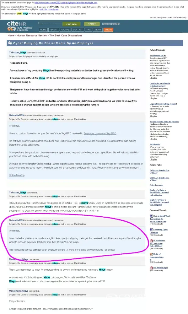 Looks like the fools of Misys Bangalore, Manoj Kumar Bhatt (Manoj Kumar, Manoj Bhatt, Manojkumar Bhatt), Raghava Kumar Molluru (Raghava Molluru, Raghavakumar Molluru) and Anil Shenoy, are using legal threats and deleting posts.