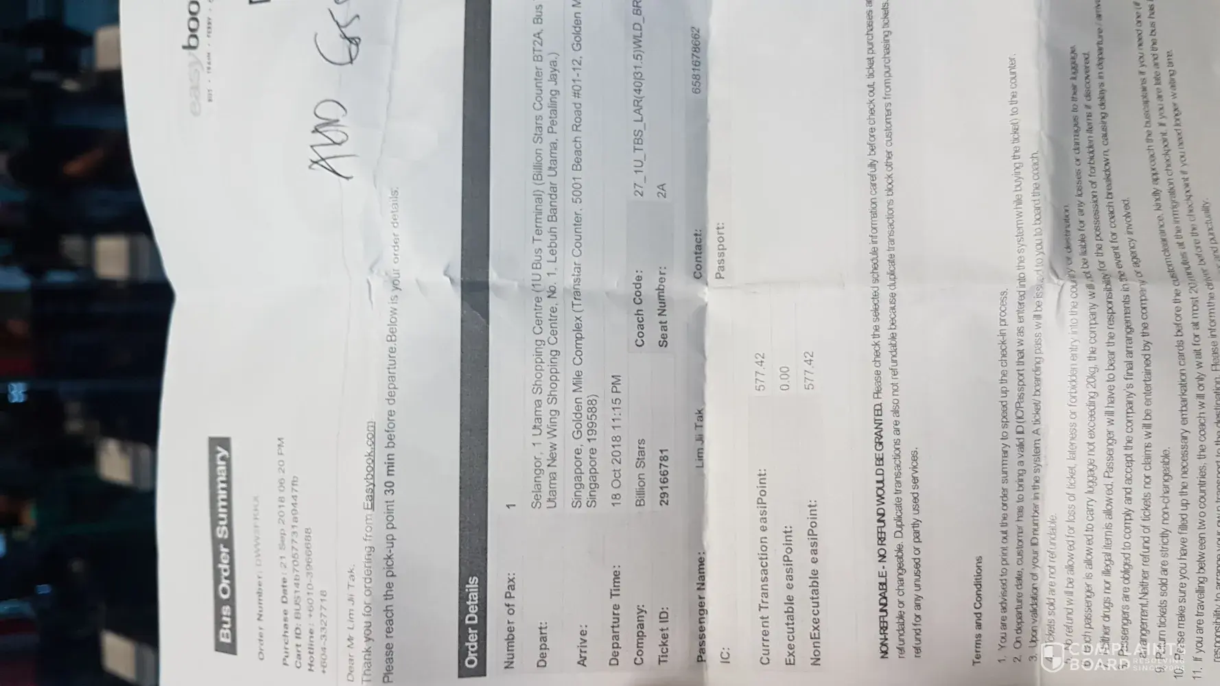 -the bus then stop at Golden Mill, wait for others passengers to get in the bus. My ticket was 11:45pm, the driver starts driving at 1am. The driver ask all the passengers to transfer to another bus with plate number IM4U 1177 when we reached Malaysia custom. Before that i did show my bus ticket to the driver and double confirm my dropoff point was One Utama. He noted his head and continue his next checking.