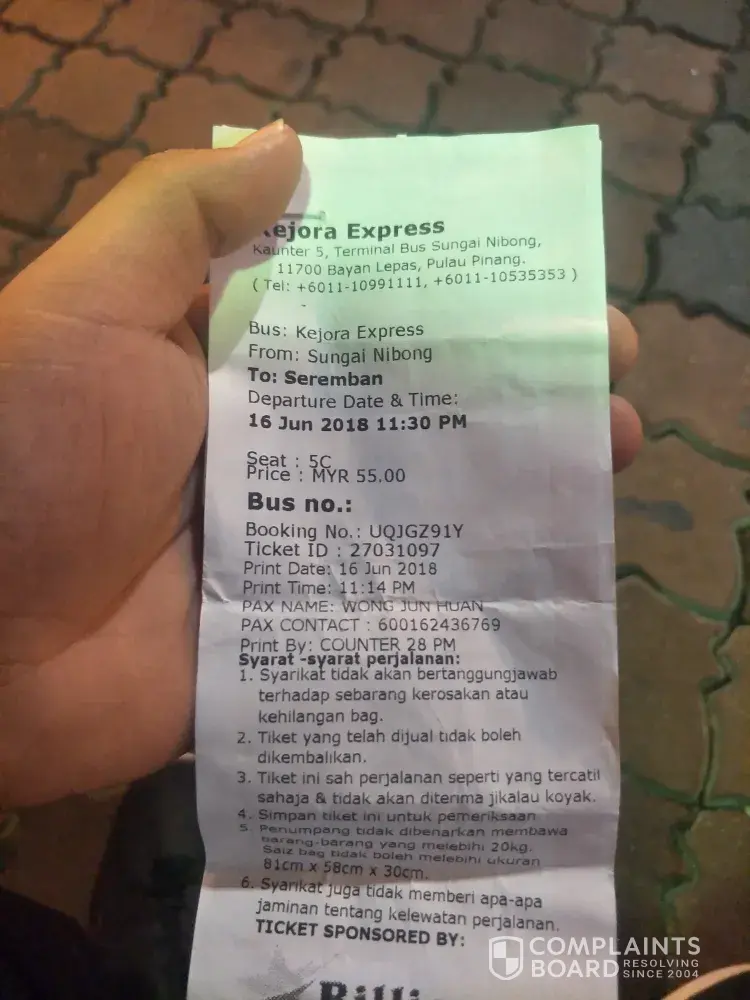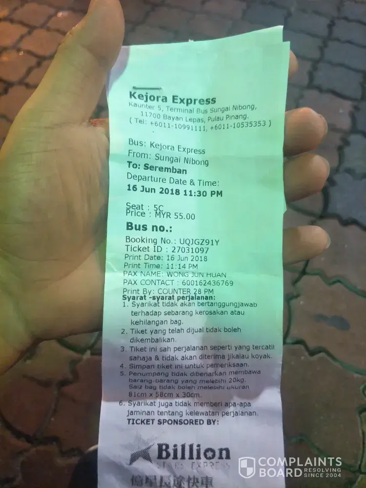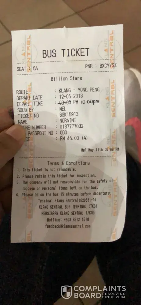 Saya telah membeli ticket bus express dari Company Billion Star Express pada 6/4/18 secara online dari web easybook.com. Jadual perjalanan saya adalah pada 8/4/18 jam 7.45am dari Penang ke Kuala Lumpur pickup saya di Komtar, Penang. Tetapi bila saya pergi ke kaunter bus express yang terletak di 33-G-14 Prangin Mall untuk cetak tiket asal, saya dimaklumkan oleh kerani yang berkenaan bahawa tiket pada tarikh, masa dan tempat saya naik bas, tidak [protected]@ ada di Komtar Penang.Saya perlu datang awal ke Komtar iaitu seawal jam 6.30am supaya mini van company hantar saya ke Stesen Bas Sungai Nibong agar saya meneruskan perjalanan saya pada jam 8.30am.Tidak ada jadual bas dari Billion Stars yang bertolak sama ada jam 7am, 7.45am @ 8am.Saya akan membawa perkara ini ke perhatian pihak KPDNKK dan SPAD